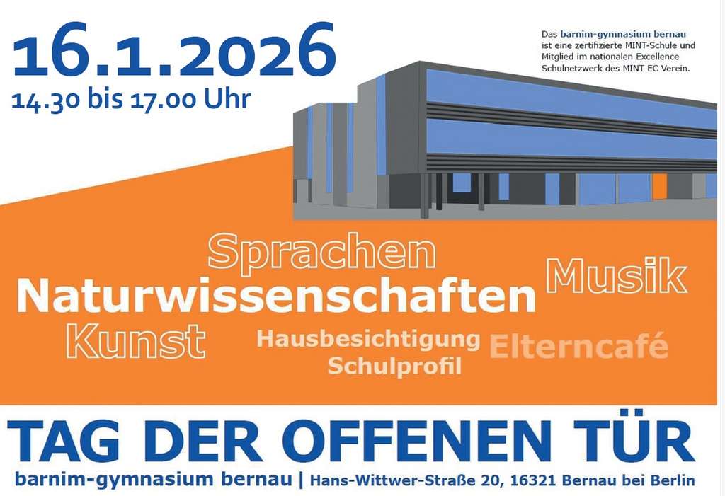 Am 16. Januar 2026 öffnen diese Partner ihre Türen: das Barnim-Gymnasium, das Oberstufenzentrum I Barnim, die Pflegeschule der Michels Kliniken und das Bauhaus-Besucherzentrum. Lernt unsere Schulen, Lehrkräfte und Ausbildungsmöglichkeiten persönlich kennen, informiert euch über Projekte, Unterrichtsprofile und Karrierechancen.